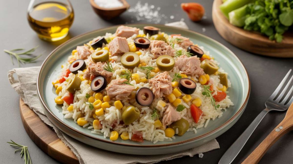 - Dans un grand saladier, mélangez le riz refroidi, le maïs égoutté, le thon émietté et les olives coupées en rondelles.