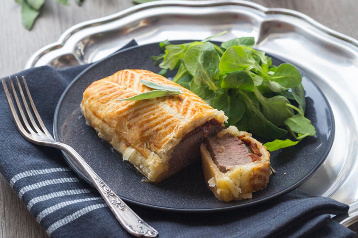 Initialement, j'avais prévu de griller les filets d'agneau pour le repas. Cependant, j'ai choisi de les envelopper dans une croûte feuilletée avec une garniture simple à base de tomates séchées et de sauge fraîche.