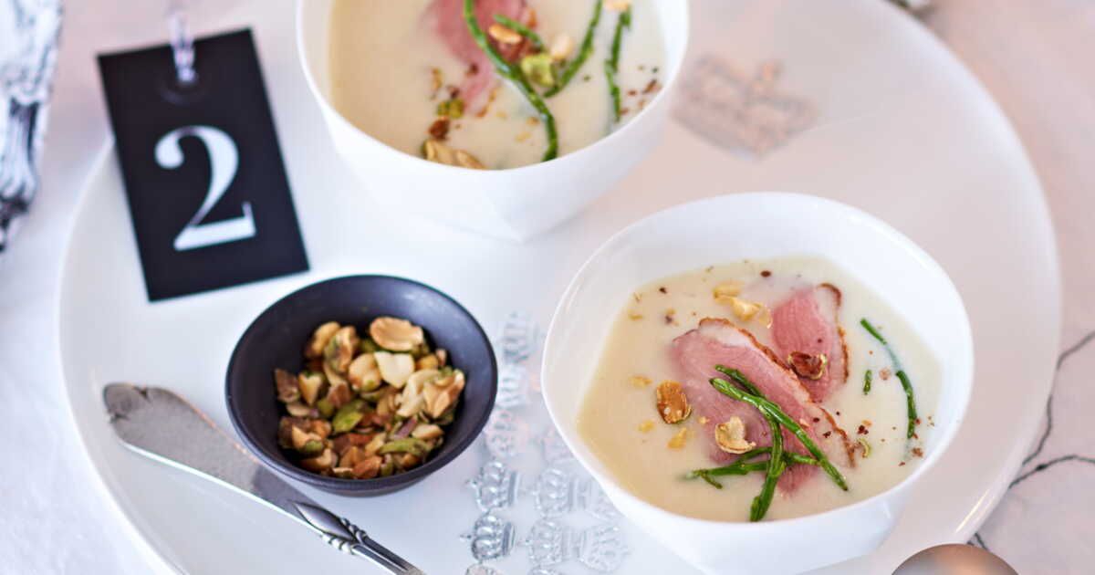 Dans des assiettes creuses, versez la crème de topinambours et ajoutez des lamelles de magrets fumés sur le dessus pour une touche gourmande. Vous pouvez également décorer avec un brin de ciboulette pour rehausser le visuel.