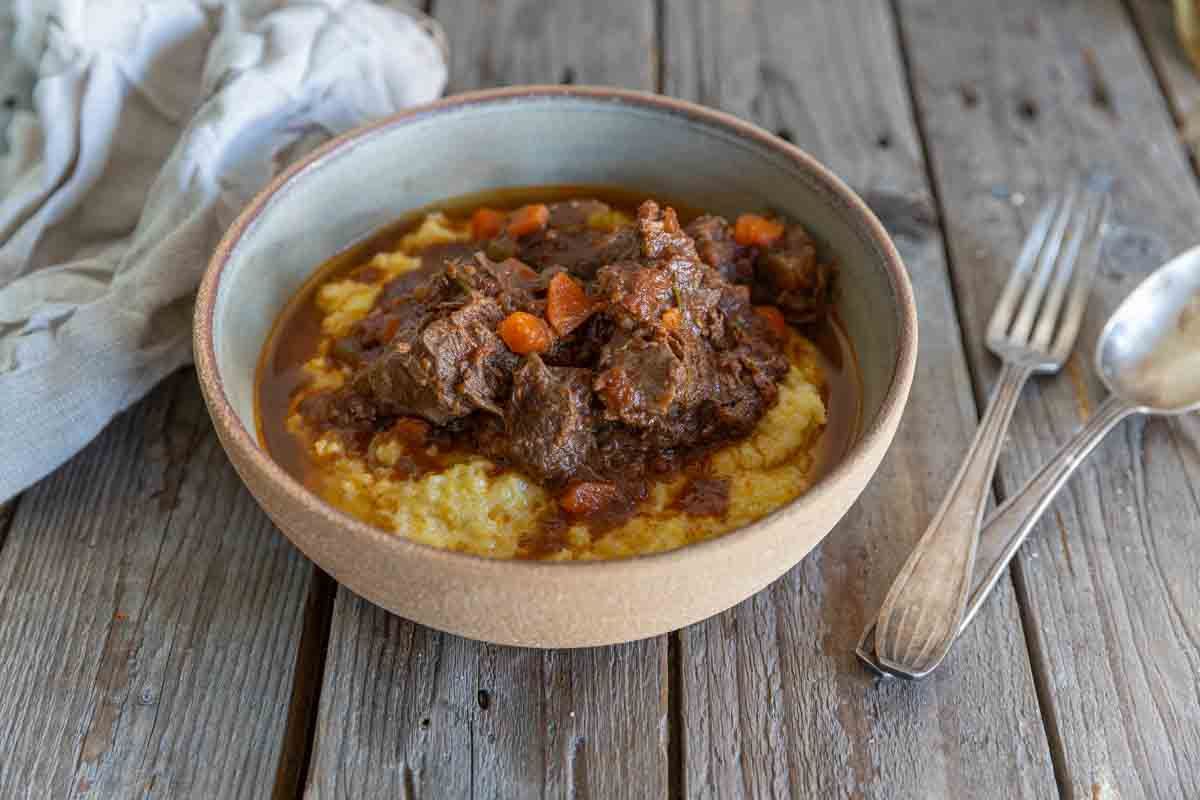 La polenta crémeuse est un accompagnement classique pour le boeuf mijoté. Pour 4 personnes, faites chauffer 500 ml de lait dans une casserole à fond épais. Incorporez 100 g de polenta en remuant sans cesse pour éviter les grumeaux.