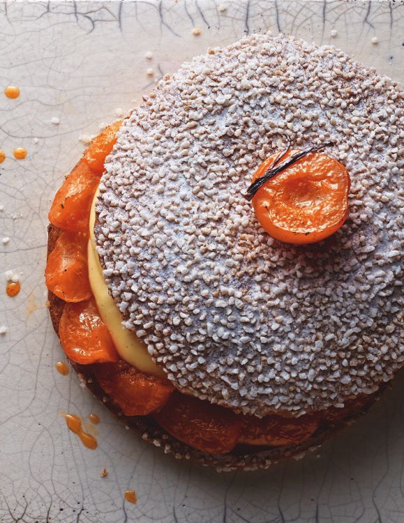 Une fois la brioche refroidie, coupez-la en deux. Imbibez légèrement les bords d'eau de fleur d'oranger, garnissez de crème pâtissière et ajoutez des fruits poêlés, comme des abricots ou des pêches, pour une touche fruitée qui rehausse le tout. Refermez délicatement et saupoudrez de sucre glace avant de servir.